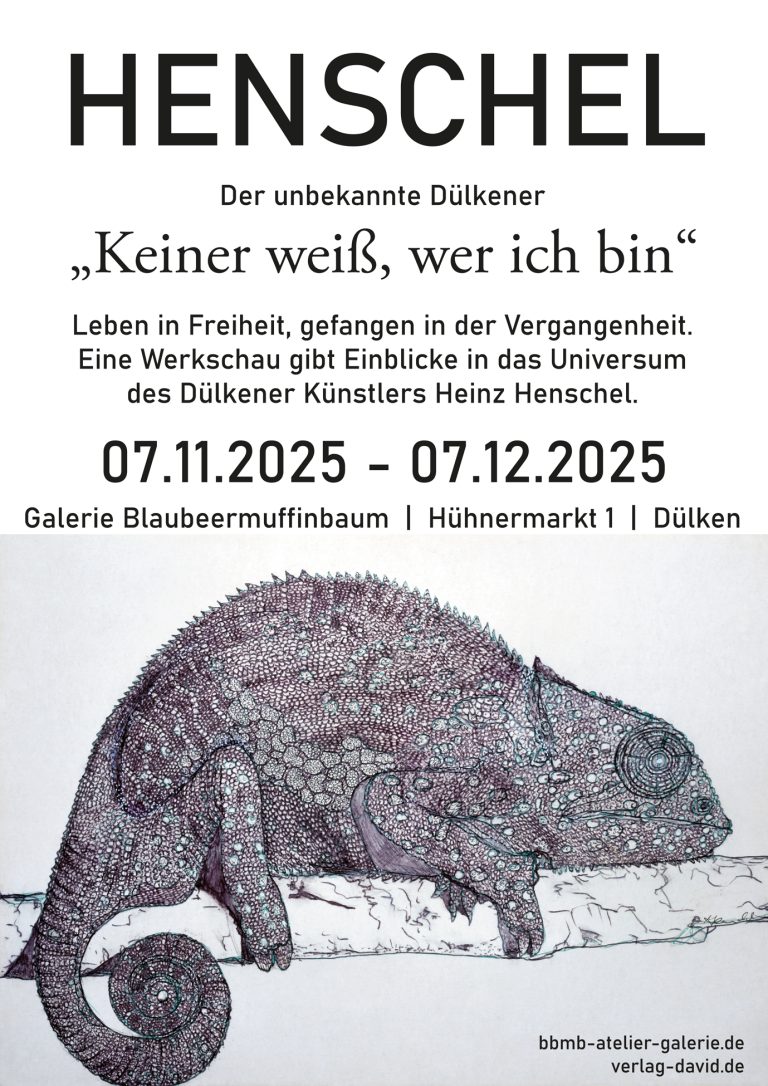 David, Erbe der Sammlung, der weder Autor noch Kunsthistoriker ist, hat den Versuch gewagt und die Geschichte von Heinz Henschel ergründet und dies festgehalten. Sieben lange Reisen in die Heimat Henschels waren dazu nötig; Wobei zu Beginn nicht einmal klar war, wo dessen Heimat eigentlich liegt. Auf 180 Seiten schildert David wie er zusammen mit seiner Tochter Amelie, die Biografie des Künstlers Stück für Stück mit neuem Wissen füllen konnte, immer wieder Rückschläge erlebte, falschen Informationen aufgesessen ist und am Ende doch einen erstaunlich tiefen Einblick in das Leben und Schaffen Henschels gewinnen konnte. ISBN: 978-3-9820830-1-8